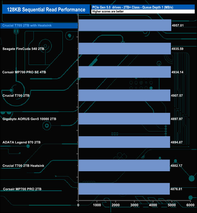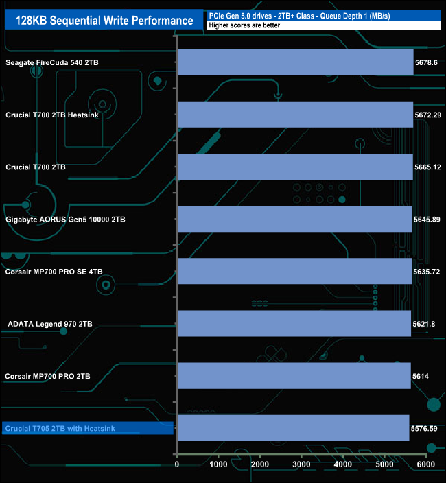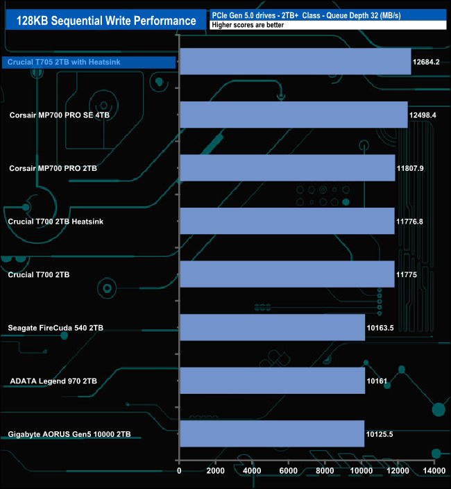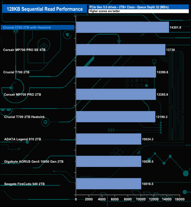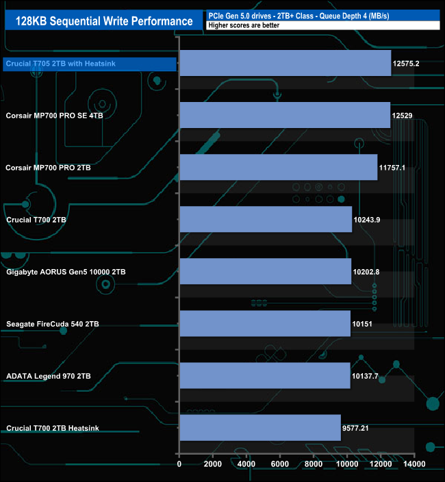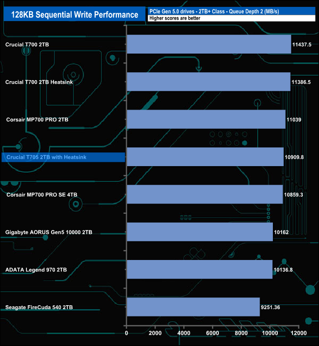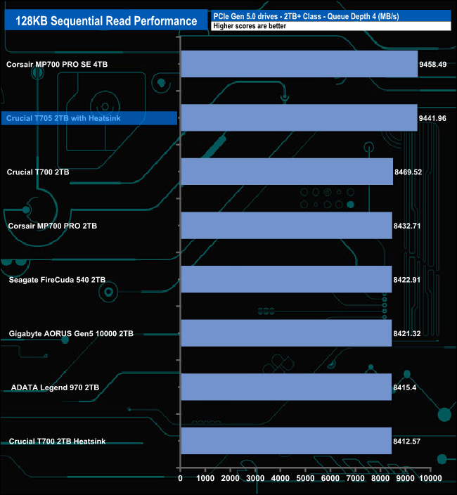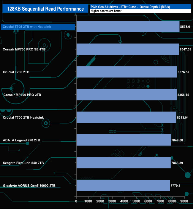 The 2TB Crucial T705 with Heatsink is the fastest drive we've seen in this test at all the tested queue depths except for QD4, where it sits in second place, just behind Corsair's MP700 PRO SE.