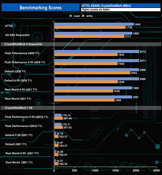 The best figures we saw for both reads and writes came from the CrystalDiskMark 8 test runs. The best-read figure of 2,072MB/s came when testing the drive using the Peak Performance profile (QD8 T1) while the fastest write performance (1,854MB/s) came from the default test (QD8 T1).