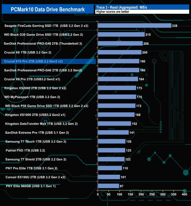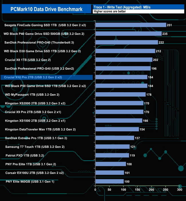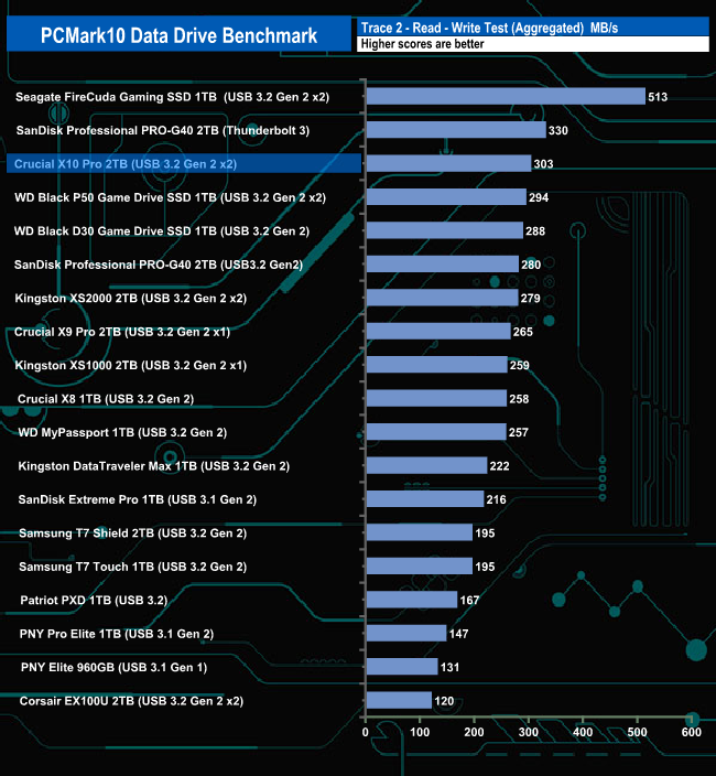 The Crucial X10 Pro does pretty well in PCMark 10 Data Drive Benchmark. It sits in the top 10 drives for all three parts of the benchmark run (Read-Write, Read and Write traces) with the Write test appearing to be the weakest of the three. Its overall bandwidth figure of 234MB/s is good enough to see the drive sit in third place on our results chart.