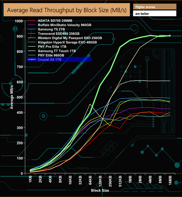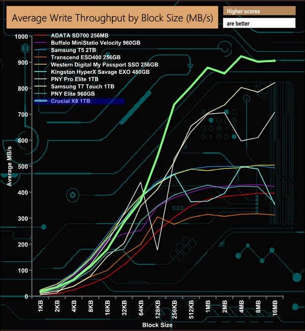 When it comes to write performance, the X8 is the fastest USB drive we've tested to date, peaking at 922MB/s (4MB block) before dropping back to finish the test run at 905MB/s.