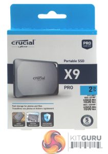 The Crucial X9 Pro comes in a compact box with an image of the drive on the front, which isn't life size but not too far off it. To the right of the image is a sticker that displays the drive's capacity, under which are displayed the read and write ratings in English and French. Under the drive image are two small images stating that the drive is dust and water-resistant. Next to these is an icon representing the fact the drive supports password protection.