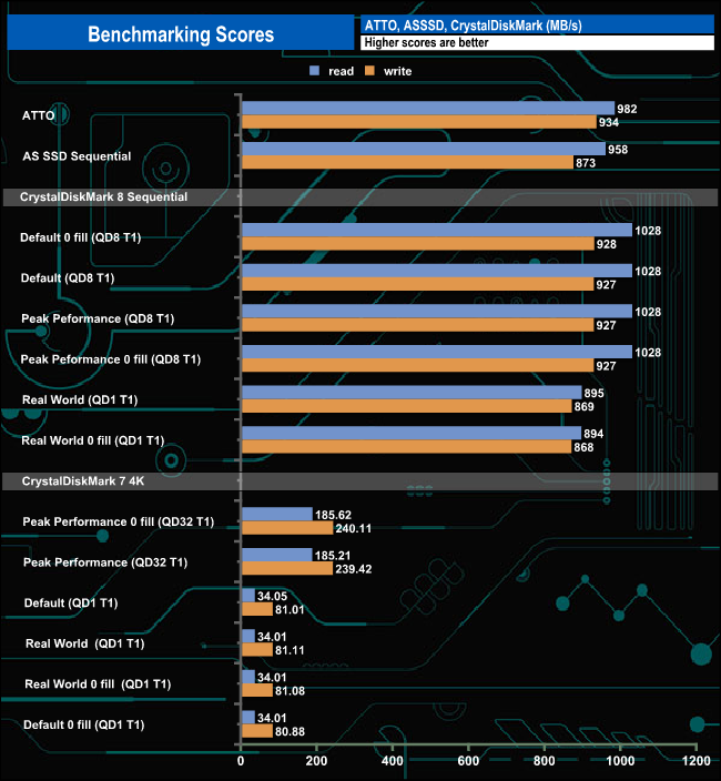Using the ATTO, AS SSD and CrystalDiskMark 8 benchmarks we couldn't hit those maximum official figures. The best read figure we saw, 1,028MB/s, came from a number of CrystalDiskMark 8 test runs using the same QD8 1T settings with both incompressible and compressible data. Write performance was even further away from the official rating. The best write result we saw of 934MB/s came from the ATTO benchmark testing.