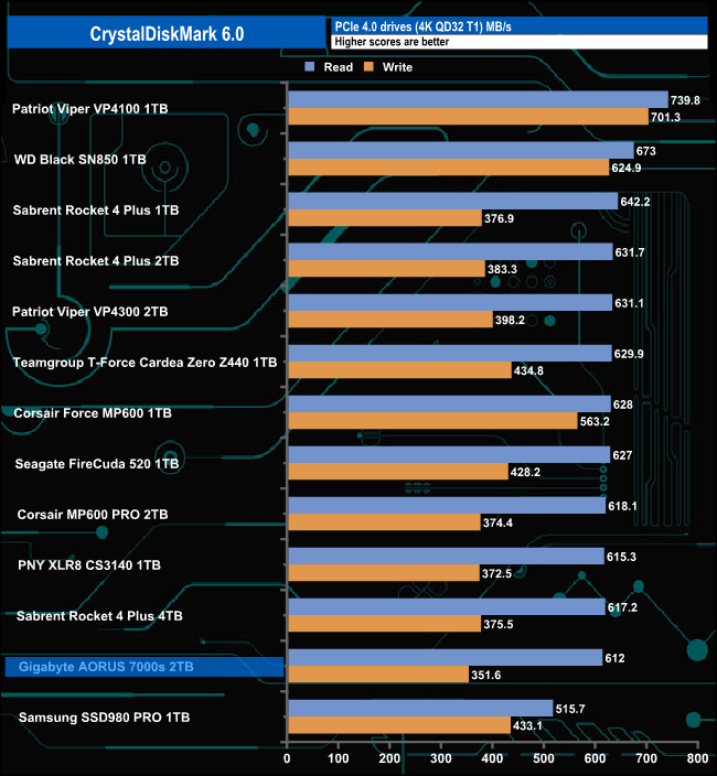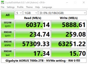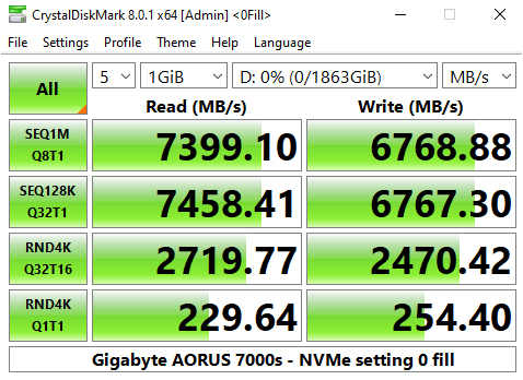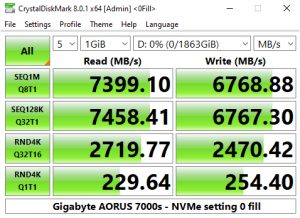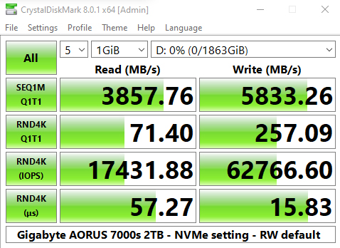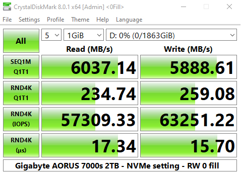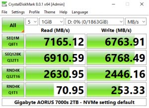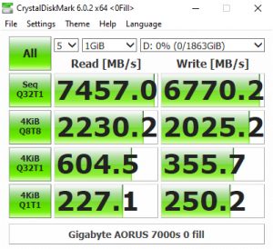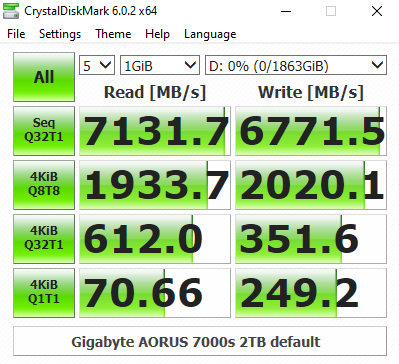 Gigabyte's Aorus 7000s does seem to struggle with the 4K QD32 T1 test in CrystalDiskMark 6. Having said that we could confirm the official maximum Sequential read performance figure for the drive of 7,000MB/s with a tested CDM v6 read figure of 7,131MB/s (switching to compressed data saw this figure rise to 7,457MB/s). The tested best write figure of 6,771MB/s is 79MB/s short of the official Sequential maximum of 6,850MB/s.