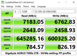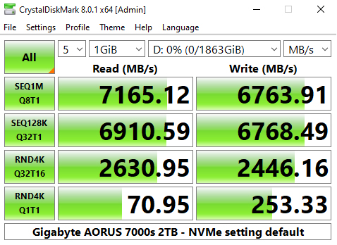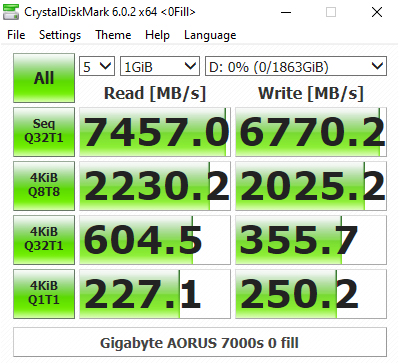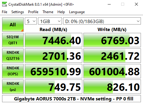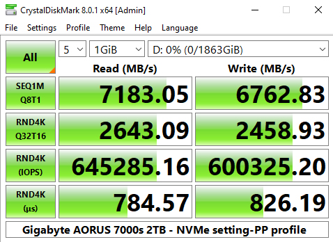 CrystalDiskMark 8 comes with a couple of interesting ready-made testing profiles as well as a dedicated NVMe setting. The best tested sequential figures for reads, 7,446MB/s (Peak Performance profile, compressed data), definitely confirms the official 7,000MB/s read figure for the drive. The best tested CrystalDiskMark 8 write figure was 6,769MB/s (Peak Performance profile, compressed data), a little short of the official maximum of 6,850MB/s.