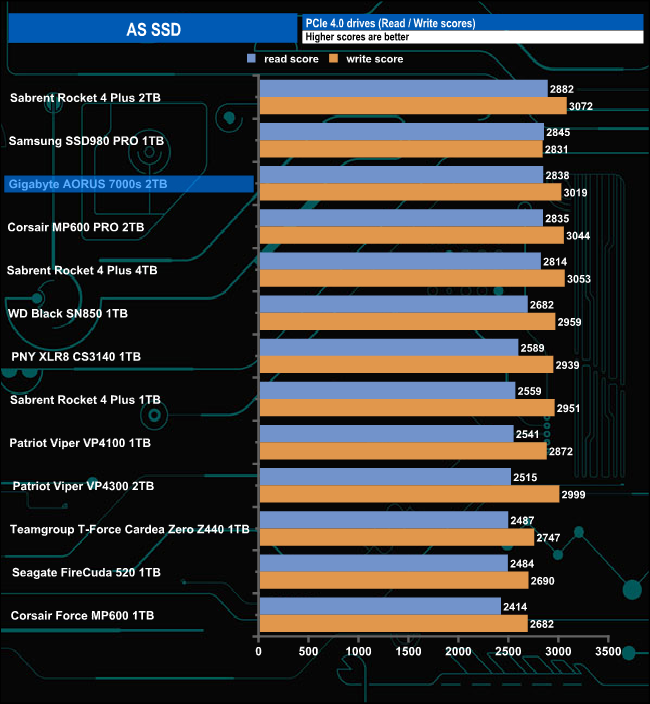The Gigabyte Aorus 7000s read score of 2838 is good enough to put the drive into third place in our ASSSD result chart.