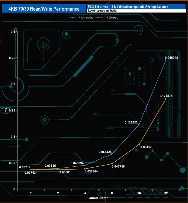 We used CrystalDiskMark 8’s custom settings to test the 4K 70/30 mixed read/write performance of the drive through a range of queue depths using a single thread and four threads.