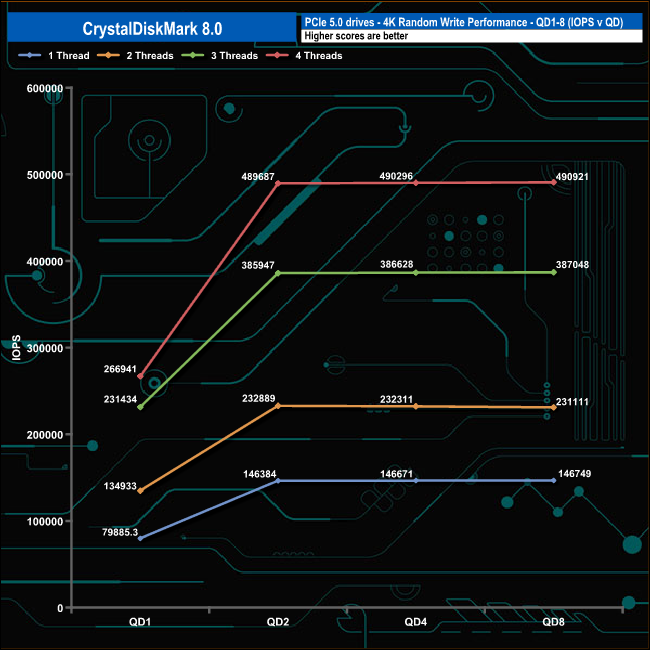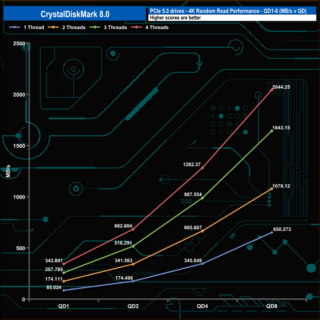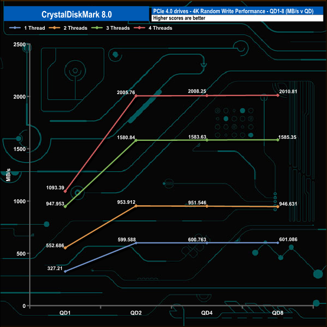 We used CrystalDiskMark 8 to test the random performance of the drive at lower queue depths (QD1 – QD8 where most of the everyday workloads occur) using 1 to 4 threads.
