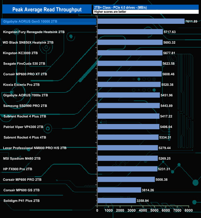 Even though that peak read result of 7,611MB/s is nowhere near the official maximum figure. it's still good to enough to place the drive in top spot in our results chart by some distance.