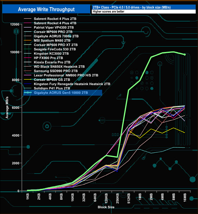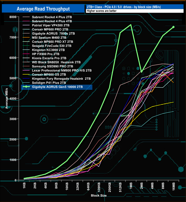In our read-throughput tests, the 2TB AORUS Gen5 10000 peaked at the 1MB block mark at 7,611MB/s, a good deal short of the maximum official figure of 10,000MB/s. After the 1MB mark, the performance of the drive drops considerably but it recovers quickly to finish the test run at 7,496MB/s.