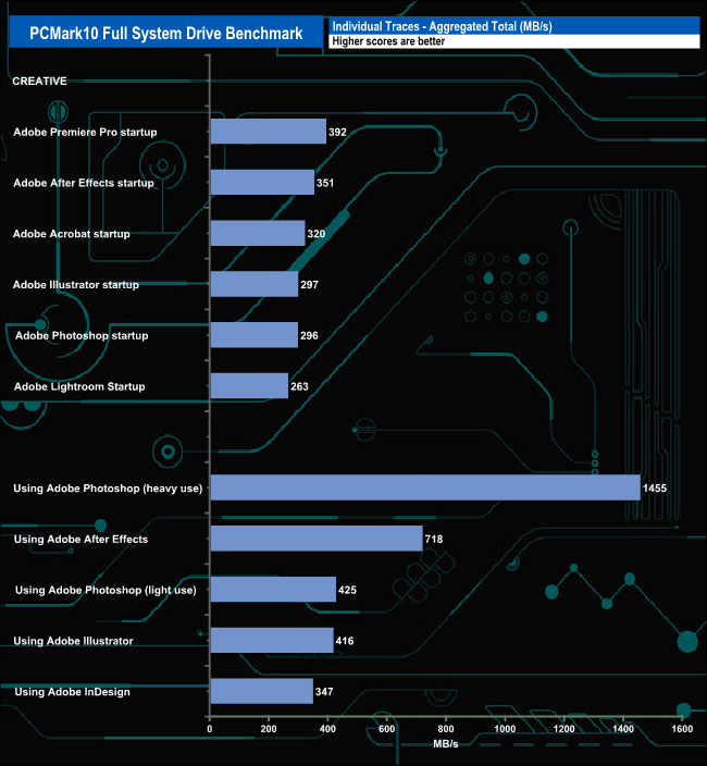 The fastest individual trace result came from the Adobe Photoshop heavy usage trace at 1,455MB/s. The drive averaged 319.83MB/s for the six Adobe start-up test traces and 672MB/s for the five usage traces including the Photoshop heavy usage one.