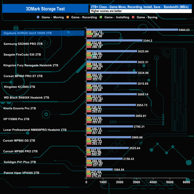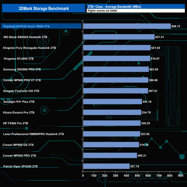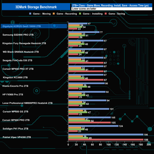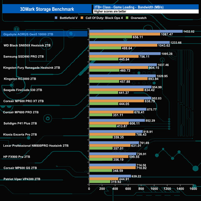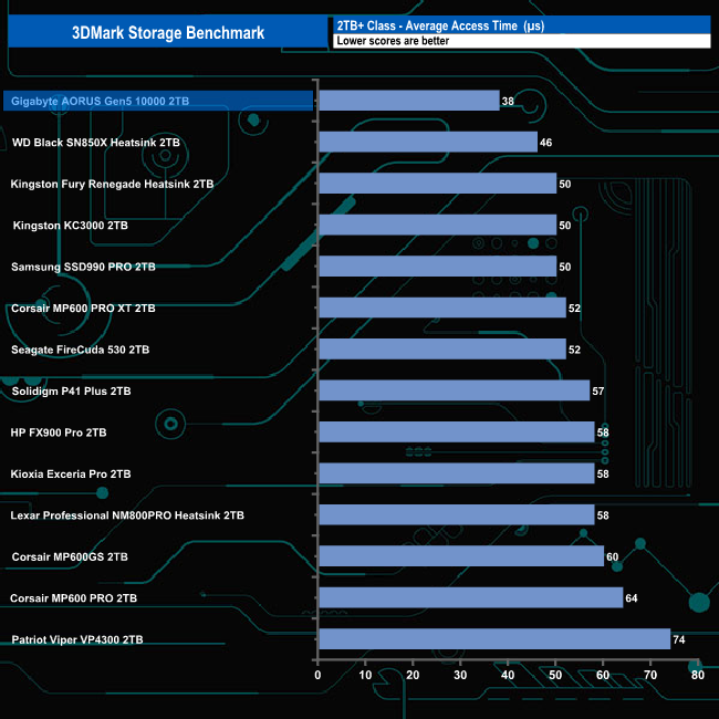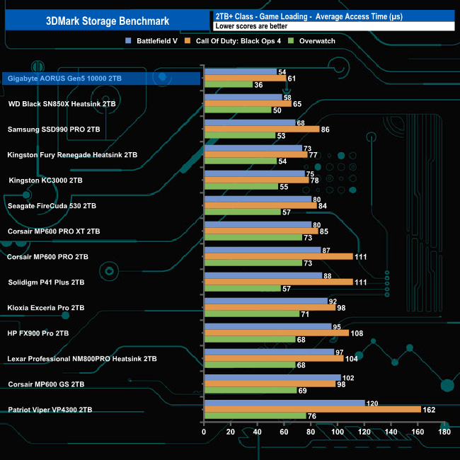 In 3DMark’s Storage Test, the AORUS Gen5 10000 produced an average bandwidth figure of 1,058MB/s for the three-game load tests (Battlefield V, Call of Duty: Black Ops 4 and Overwatch) with an average access time of 50µs for the same three games.