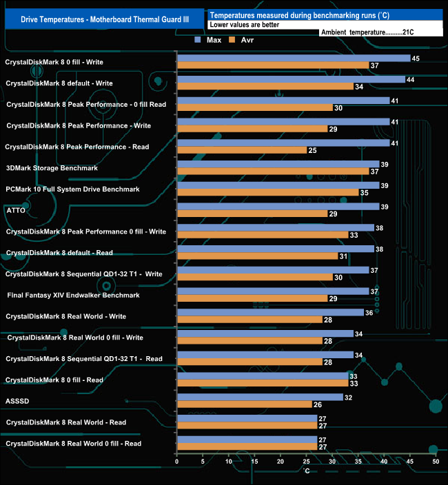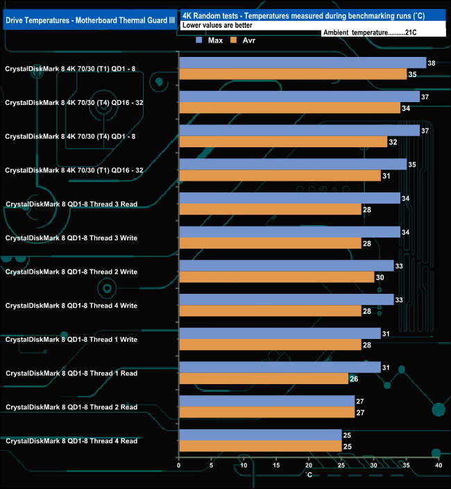 We took note of the drive’s temperature during our benchmarking runs. We ran our tests with the M.2 Thermal Guard XTREME heatsink installed that Gigabyte bundles with the drive. As it's such a large chunk of cooler and may be difficult to fit on some motherboards we also re-ran the tests using the motherboard's SSD cooling solution to see if it could cope with keeping the drive cool.