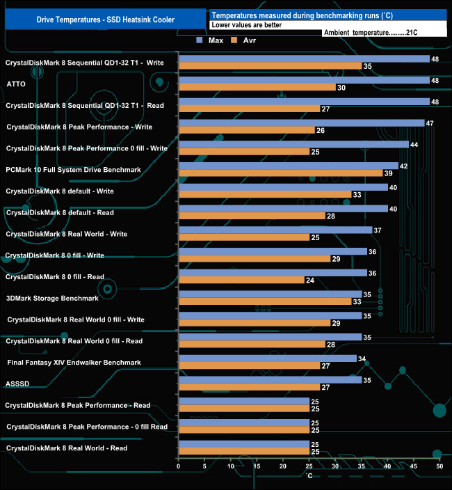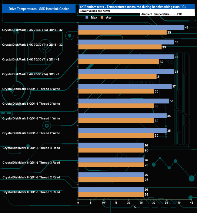 With the M.2 Thermal Guard XTREME heatsink fitted the hottest the drive got was when being pushed extremely hard during repeated runs of the CrystalDiskMark 8 Sequential read and write tests as well as runs of the ATTO benchmark where the drive got to 48° C, some 22° C below the stated maximum of 70° C but there didn't appear to be any throttling issues. For the bulk of our non-4 K testing the drive's temperature averaged around 38° C. For the 4K testing, it averaged just over 33° C.
