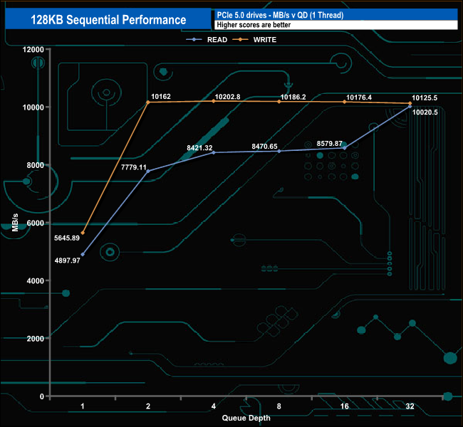 In this test, the read performance of the drive accelerates sharply from QD16 (8,579MB/s) to the end of the test run at QD32 with a result of 10,020.5MB/s. The write performance is much more consistent peaking at 10,186.2MB/s (QD8) before slowly falling back to finish the test run at 10,125.5MB/s.