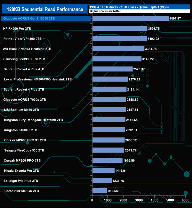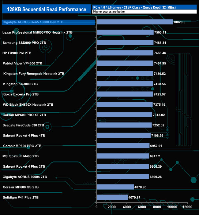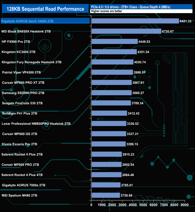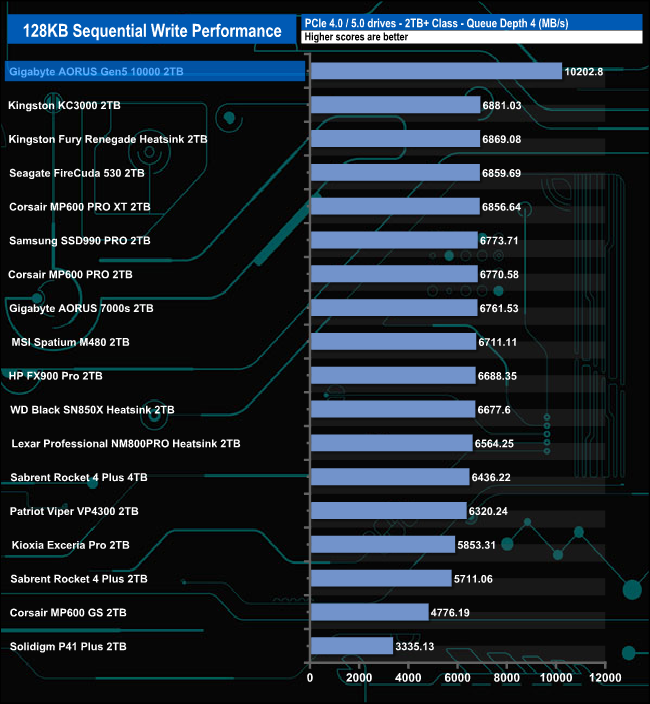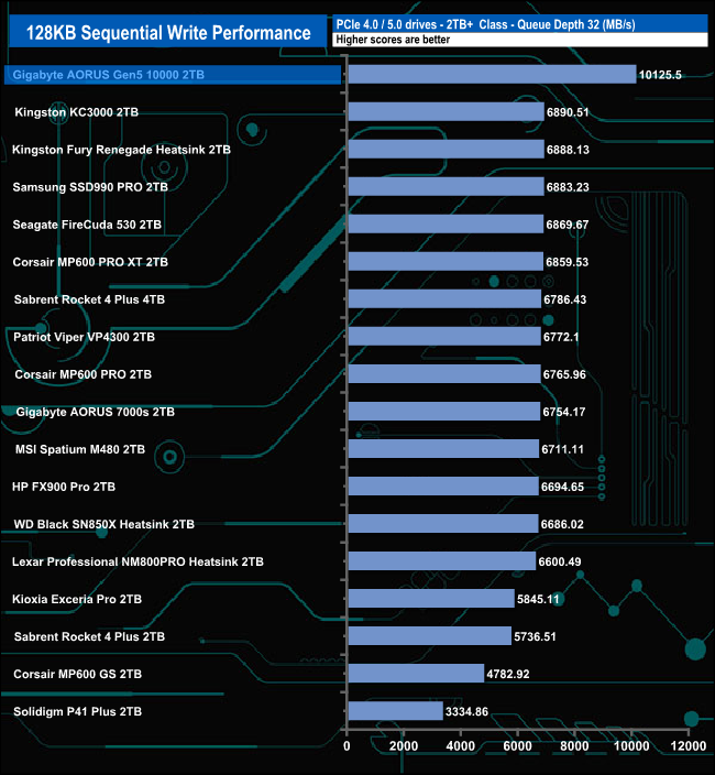 In the Sequential write test, the drive tops the charts by quite some margin at every tested queue depth. The closest any of the Gen4 drives gets is at QD1 where the WD Black SN850X Heatsink edition gets to within 1,371.22MB/s of Gigabyte's drive.