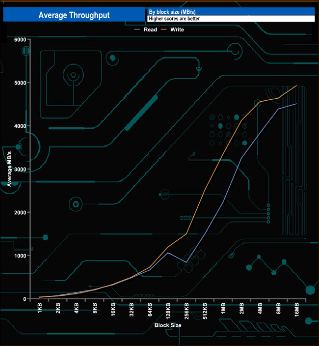 In our read throughput test, the drive's performance drops between the 128KB and 256KB Block sizes but recovers well to finish the test run at 4,507.73MB/s. The write performance climbs pretty steadily for the duration of the test, finishing at 4,928.67MB/s.