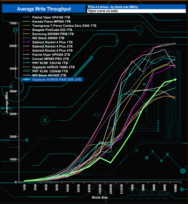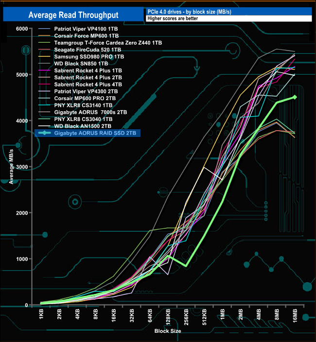 While the AORUS RAID SSD can't keep up with the latest 2nd generation PCIe Gen 4 drives, it outperforms a good number of the first-generation drives in both our throughput tests.
