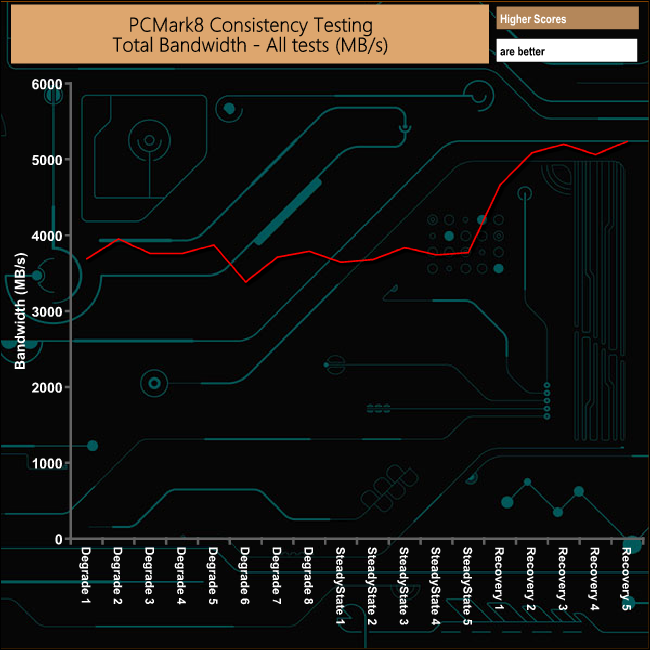 Overall the Aorus RGB drive handles the rigours of PCMark 8's Consistency Test very well, although there is a noticeable drop in bandwidth during the sixth Degradation run. The drives performance during the recovery phases is excellent.