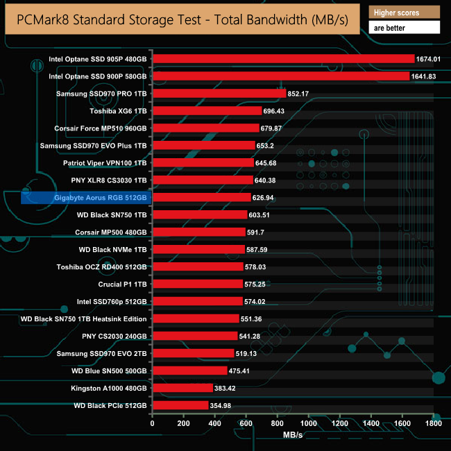 Gigabyte's Aorus RGB drive produced an overall bandwidth speed of 626.94MB/s for PCMark 8's Standard Storage test, a wee bit slower than the PNY XLR8 CS3030 and Patriot's Viper VPN1000 which use the same NAND and controller combination as the Aorus RGB.