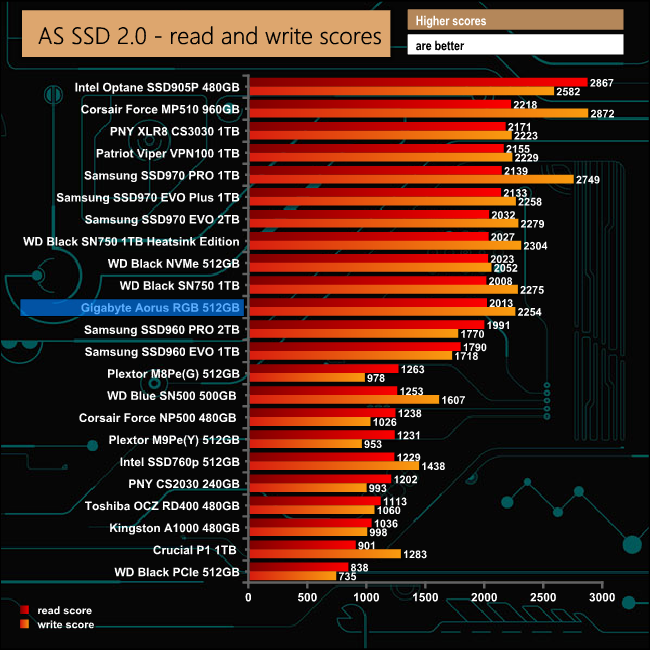 The read score of 2013 in the AS SSD benchmark puts the 512GB Gigabyte Aorus RGB firmly in the middle of our results chart. The write score of 2254 is very strong.