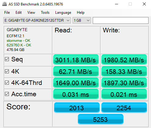 The read score of 2013 in the AS SSD benchmark puts the 512GB Gigabyte Aorus RGB firmly in the middle of our results chart. The write score of 2254 is very strong.