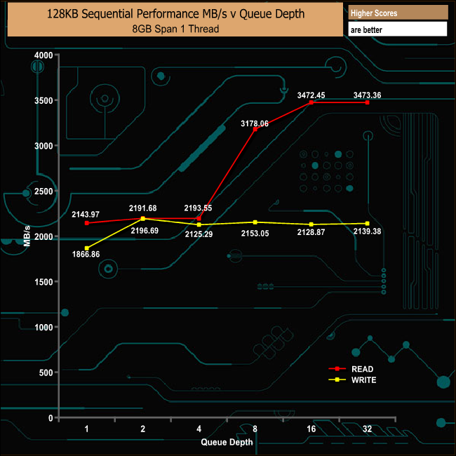 With our 128KB Sequential read/write tests we could confirm the official figures of up to 3,480MB/s for reads and up to 2,000MB/s for writes, the review drive producing 3473.36MB/s for reads with writes at 2153.05MB/s.