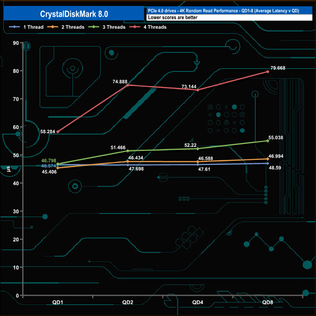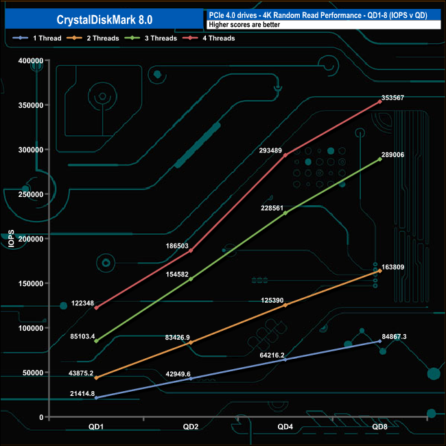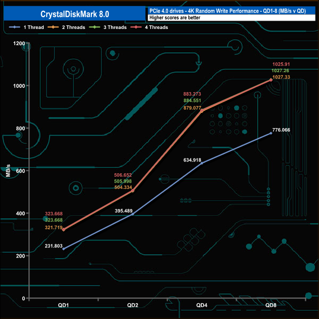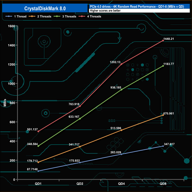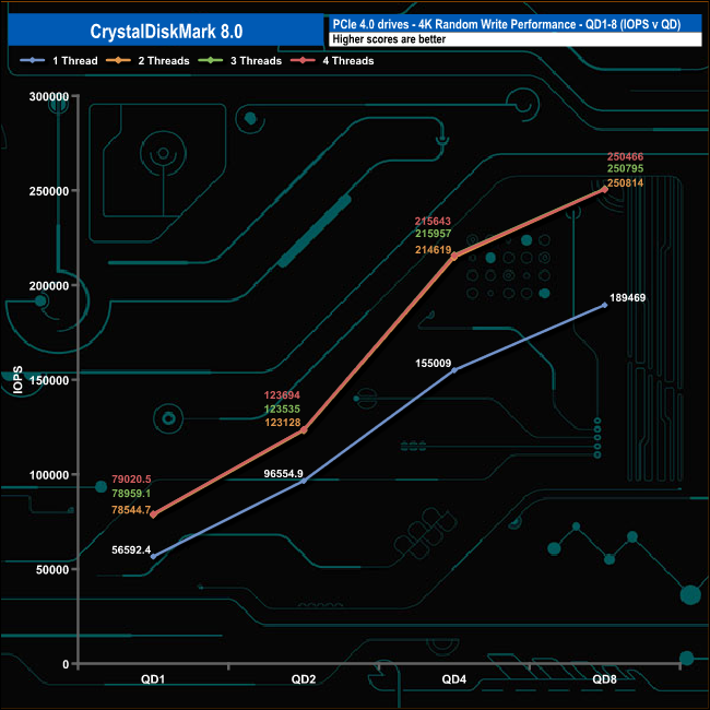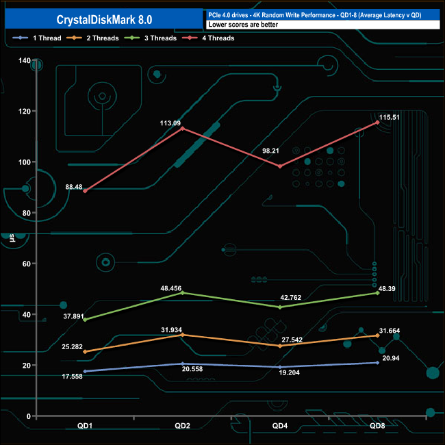 We used CrystalDiskMark 8 to test the random performance of the drive at lower queue depths (QD1 – QD8 where most of the everyday workloads occur) using 1 to 4 threads.