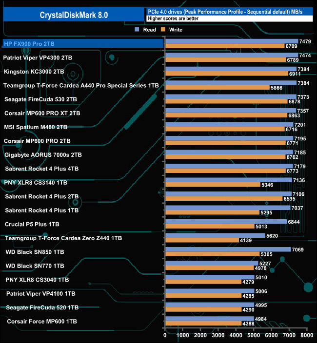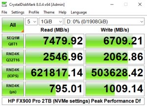 Switching over to the CrystalDiskMark 8 Peak Performance profile we could once again confirm the official Sequential read/write figures with test results of 7,479MB/s for reads and 6,709MB/s for writes.