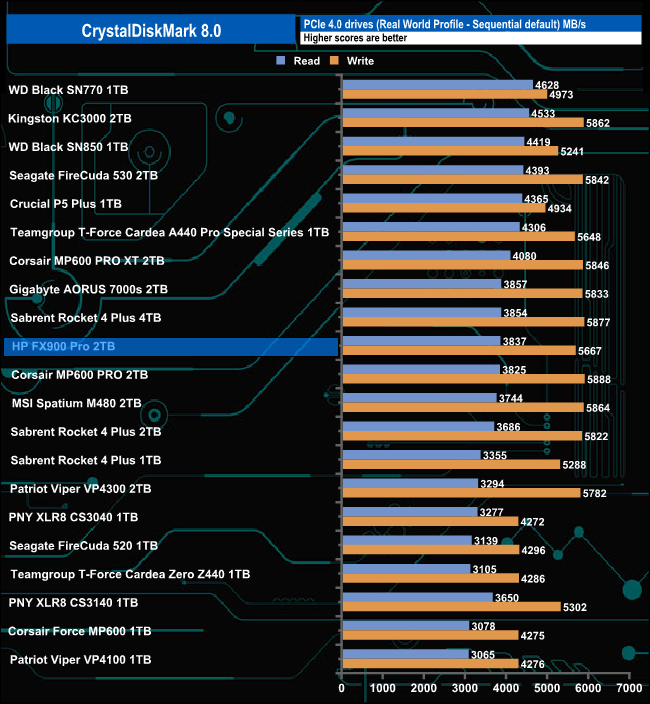 Using the Real World profile sees the drive sitting in mid-table with a Sequential read result of 3,837MB/s while write performance is much better at 5,667MB/s.