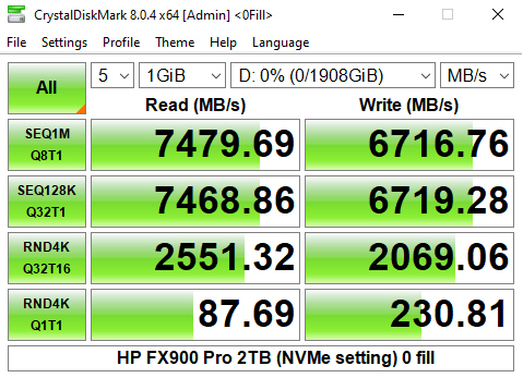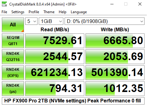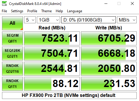 Looking at the benchmark result screens we could confirm the official read/write maximums of 7,400MB/s and 6,700MB/s with test results of 7,523MB/s and 6,705MB/s for reads and writes respectively. That tested read score of 7,523MB/s makes the FX900 Pro the fastest consumer Gen4 drive we've seen to date, although the write performance isn't as strong.