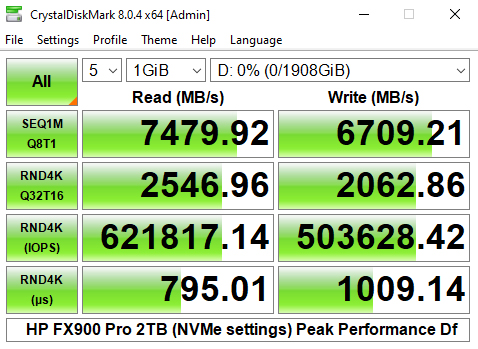 Switching over to the CrystalDiskMark 8 Peak Performance profile we could once again confirm the official Sequential read/write figures with test results of 7,479MB/s for reads and 6,709MB/s for writes.