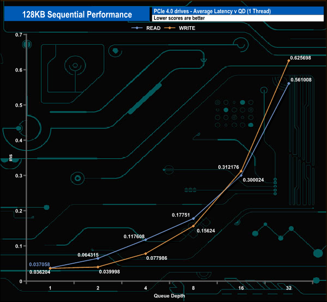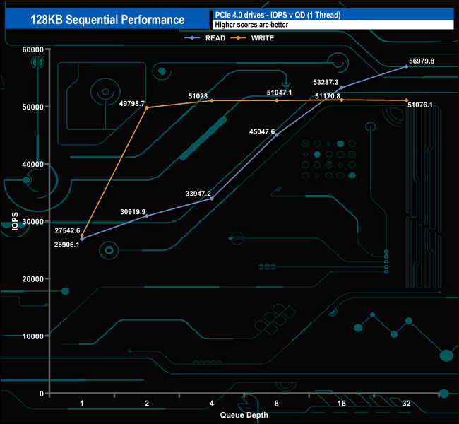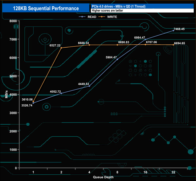 In the 128KB Sequential read and write tests, the drives read performance climbs smoothly as the queue depth deepens, reaching 7,468.45MB/s at the end of the test run at QD32, a figure that just about confirms the official maximum speed of 7,400MB/s.