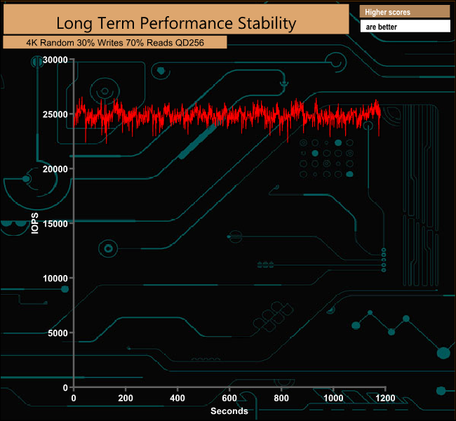 For the long term performance stability test, we set the drive up to run a 20-minute 4K random test with a 30% write, 70% read split at a Queue Depth of 256 over the entire disk. The 4TB SVR-PRO 100 SRI averaged 24,828 IOPS for the test with a performance stability of 94% .