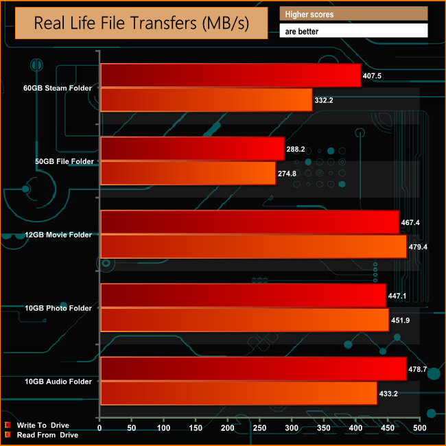 The drive handles reading and writing large file sizes with ease as can be seen by the performance for the Movie, Photo and Audio folder transfer speeds. It's much less happy dealing with the small bity files contained in the 50GB File Folder.