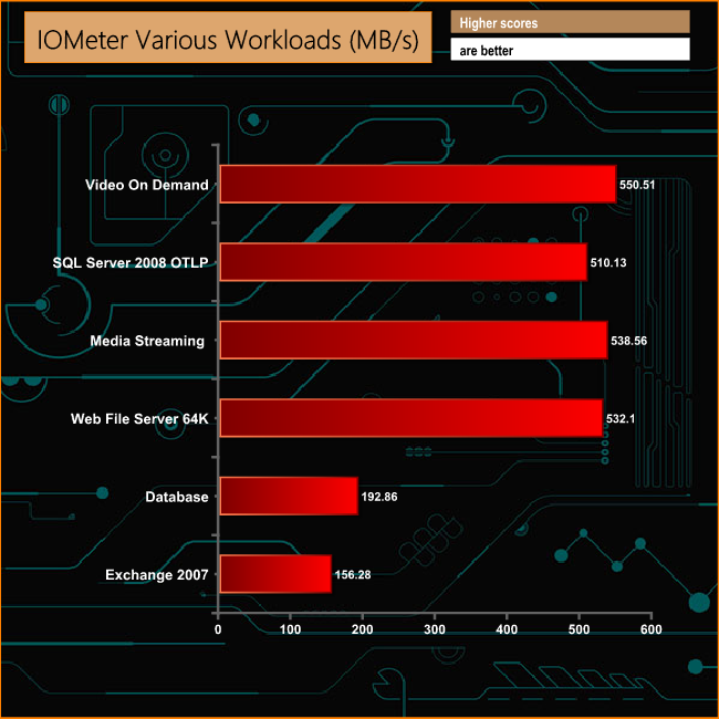 We also tested the drive with various IOMeter simulations that it might be used for in a work environment. The drive shows its read-intensive credentials when dealing with the read intensive applications; SQL Server 2008 OLTP, Web File Server 64KB, Media Streaming and Video On Demand. The performance drops considerably when it deals with less read-intensive operations.