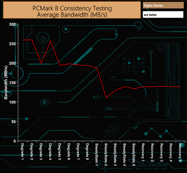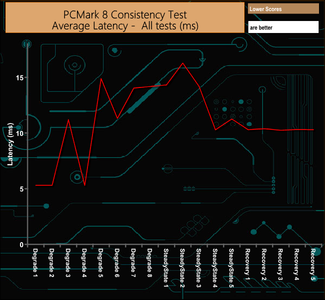 The drive didn't handle PCM8 Consistency test too well with high latency results throughout the final parts of the degradation tests and when in a steady state. It didn't recover too well from the ordeal either.