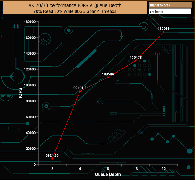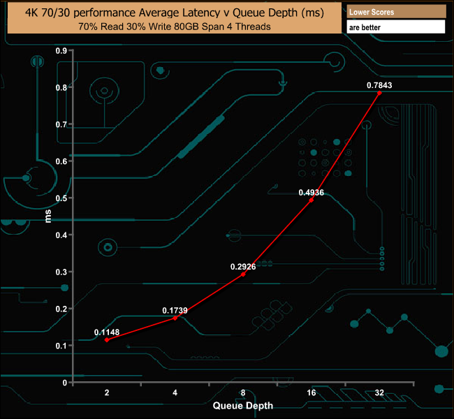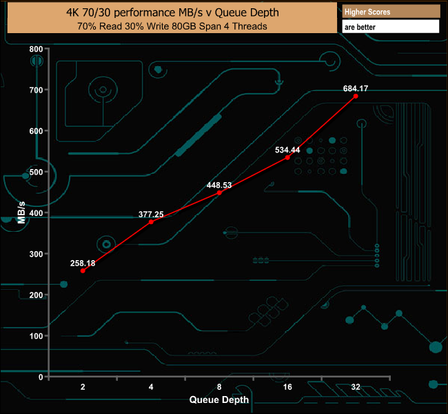 The SSD760p delivers pretty good performance in the 70/30 mixed test especially when you consider that it's aimed at the lower end of the market.