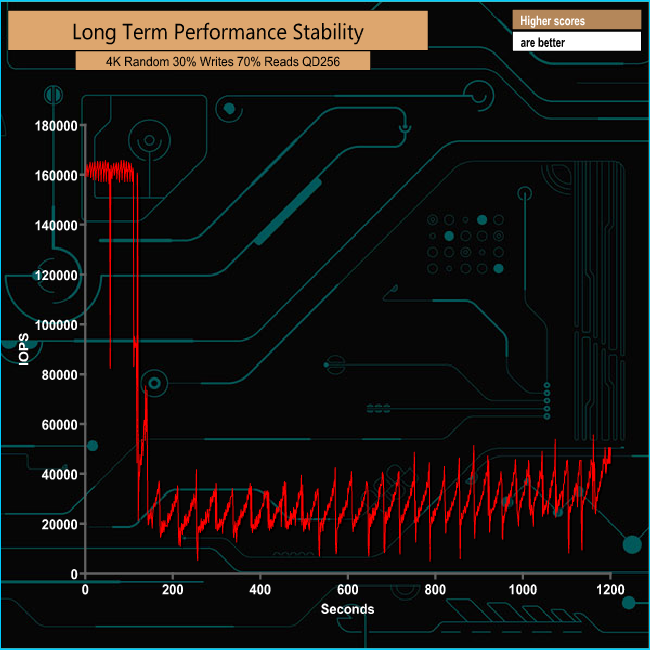For the long term performance stability test, we set the drive up to run a 20-minute 4K random test with a 30% write, 70% read split, at a Queue Depth of 256 over the entire disk. The 512GB Intel 760p averaged 40,997 IOPS for the test with a performance stability of just 24.8% which isn't great to say the least.