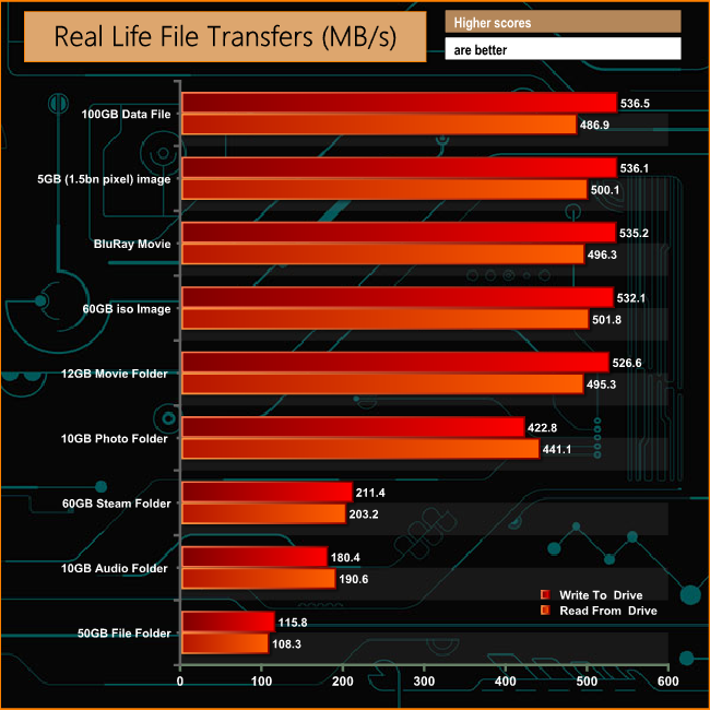 The drive deals with transferring larger file sizes much better than it does when dealing with the small bity files contained in the 60GB Steam, 50GB File and 10GB Audio folders.