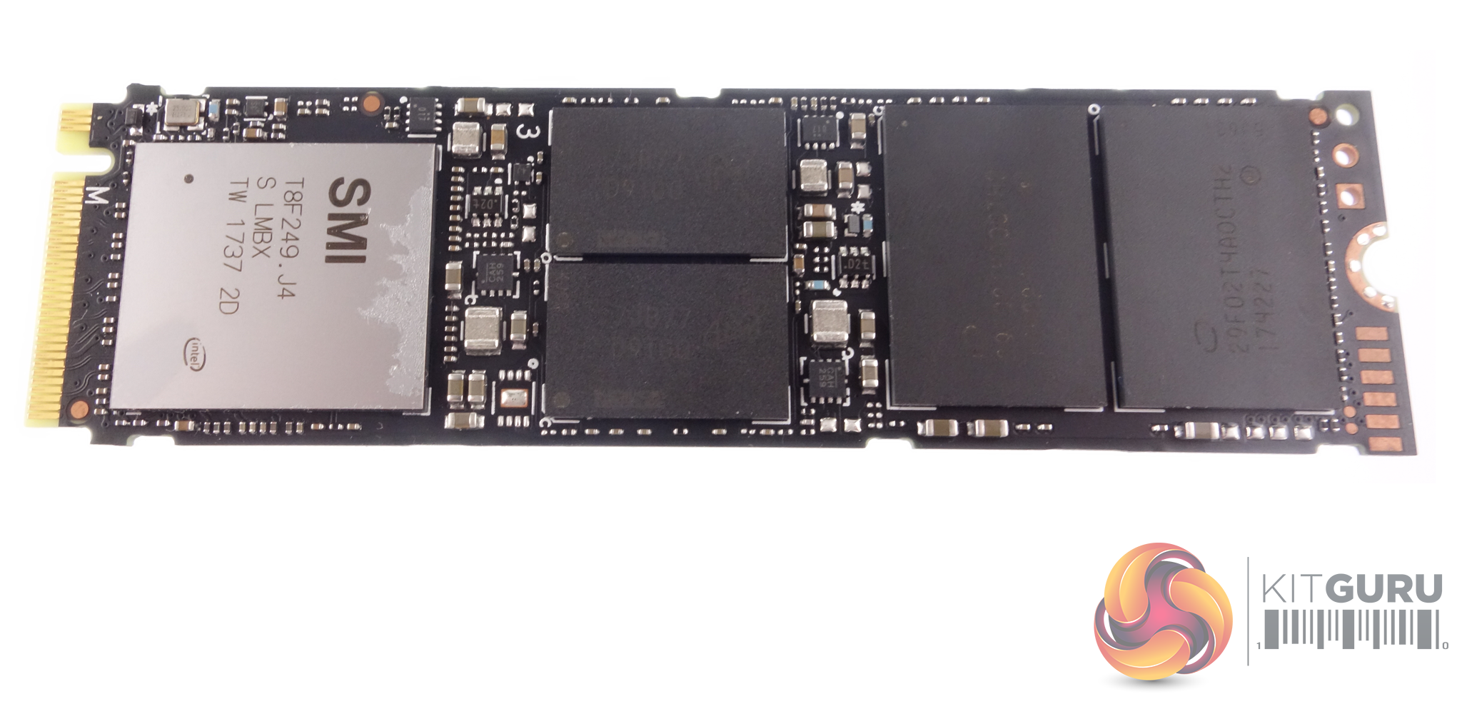 Along with the Silicon Motion SM2262 controller there are two 256Gb 64-layer 3D TLC NAND packages (labelled 29F02T4AOCTH2) and a pair of Micron DDR4-2400 256MB cache chips (labelled 7JB77). The Silicon Motion SM2262 8-channel controller has a PCIe 3 x4 NVMe 1.3 interface and supports end to end data protection, AES and TCG Opal encryption.