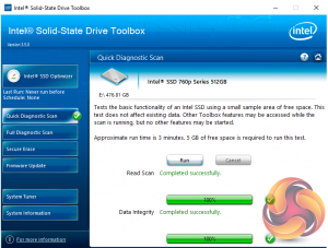 Intel Toolbox SSD management utility is a pretty comprehensive tool for looking after your SSD. The home screen displays information about the drive, how the capacity is being used, its health and estimated life remaining.