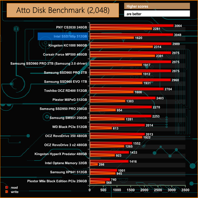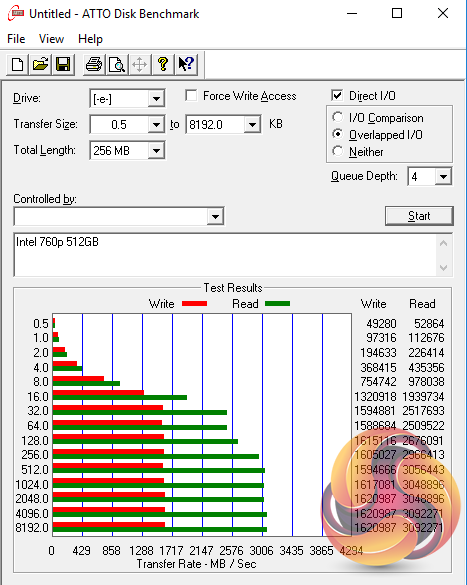 Intel's official Sequential read/write figures for the 512GB SSD760p are up to 3,230MB/s and 1,625MB/s respectively. Using the ATTO benchmark we couldn't quite reach the maximum read figure, the tested drive giving a score of 3,048MB/s. Writes however were bang on the official figure at 1,620 MB/s.