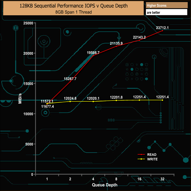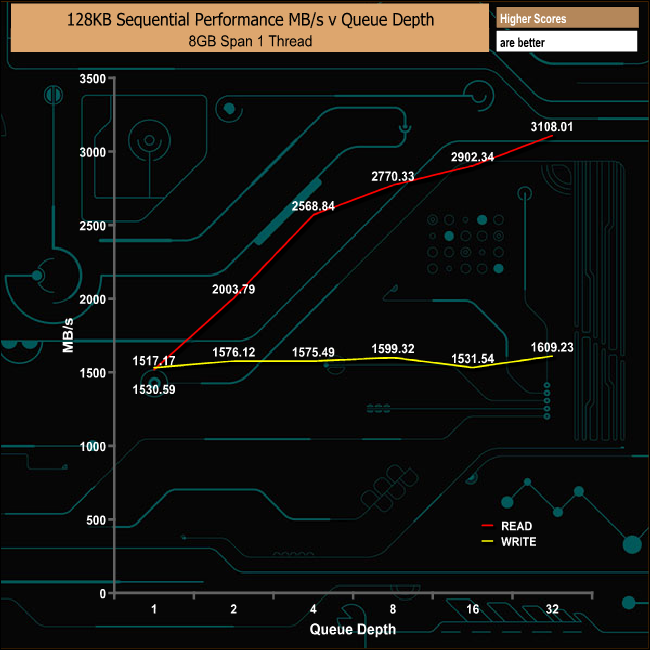 When testing the 128KB Sequential Read/Write performance, the drive fell a little way short of the maximum figures quoted by Intel for Sequential read performance. The review drive produced a read score of 3,108MB/s, short of the top figure of 3,230MB/s while the tested write score of 1,609MB/s was much closer to the official 1,625MB/s