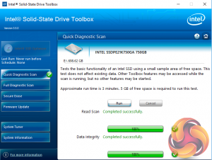 There are seven buttons on the right hand side of the utility main screen. These are for Intel’s SSD Optimiser, two drive diagnostic scans – one quick and the other full – secure erase, firmware updates, a system tuner and a page for system information.