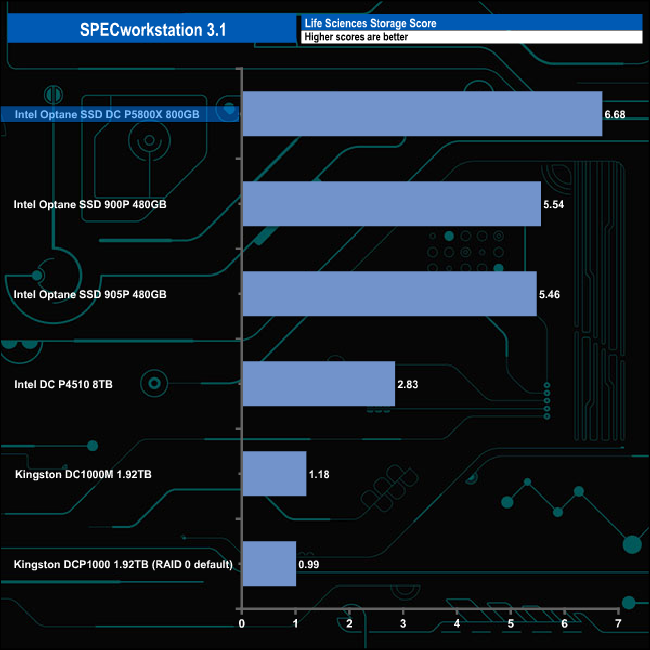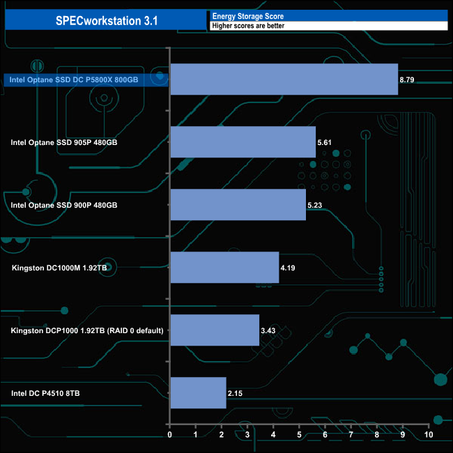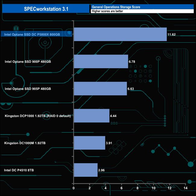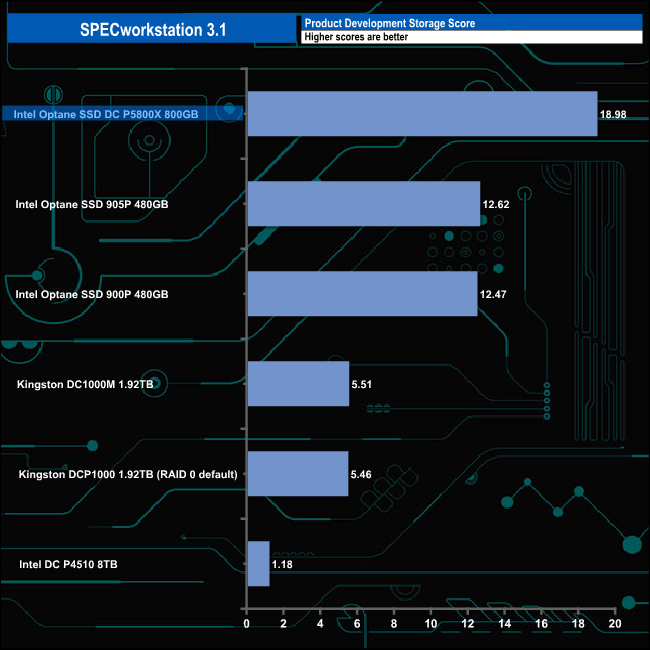 Testing the drive with the SPECworkstation 3.1 benchmark, this test shows just how powerful the DC P5800X is. It dominated all the runs leaving every other drive in its wake.