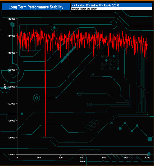 For the long term performance stability test, we set the drive up to run a 20-minute 4K random test with a 30% write, 70% read split, at a Queue Depth of 256 over the entire disk. The Optane SSD DC P5800X averaged 110,743 IOPS for the test with a performance stability of 98%, a figure you should expect from a drive primarily aimed at data centre usage.
