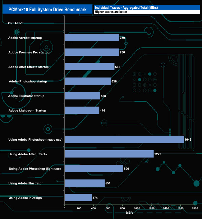 The PCMark 10 Full System Drive Benchmark uses a wide-ranging set of real-world traces from popular applications and common tasks to fully test the performance of the fastest modern drives. The benchmark is designed to measure the performance of fast system drives using the SATA bus at the low end and devices connected via PCI Express at the high end.