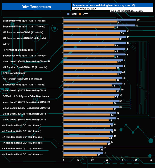 Although the drive gets warm, it didn't get too close to the 70° C limit where the drive begins to start throttling back. The drive peaked at 50° C during the performance stability test, a test that really pushes a drive.