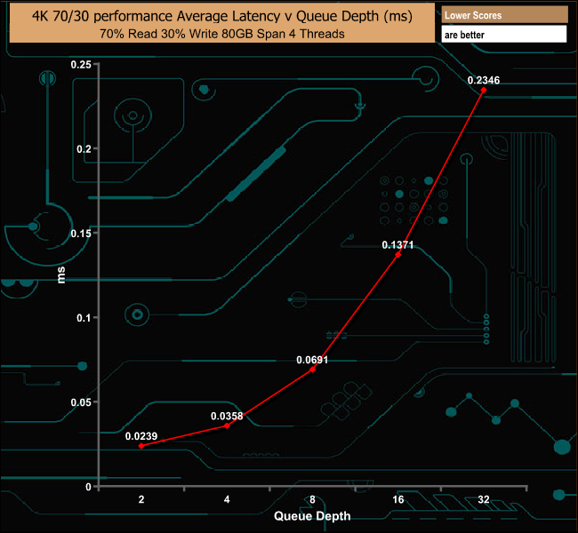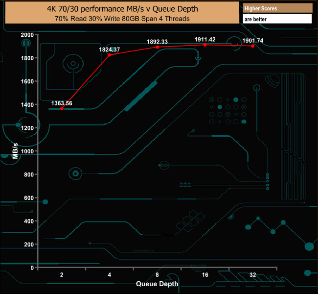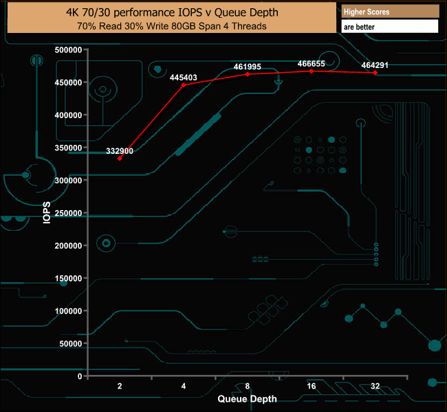 In the 70/30 read/write mixed test the drive performs well peaking at 466,655 IOPS (1911.42MB/s).