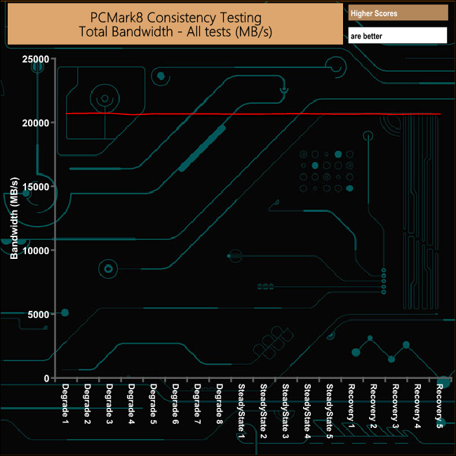 Overall Intel's Optane SSD 905P sails through PCM8's Consistency test with hardly a blip in performance which is quite remarkable.